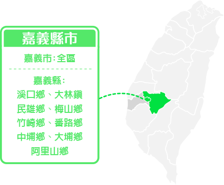 | 嘉義縣(溪口鄉、大林鎮、民雄鄉、梅山鄉、竹崎鄉、番路鄉、中埔鄉、大埔鄉、阿里山鄉 | |