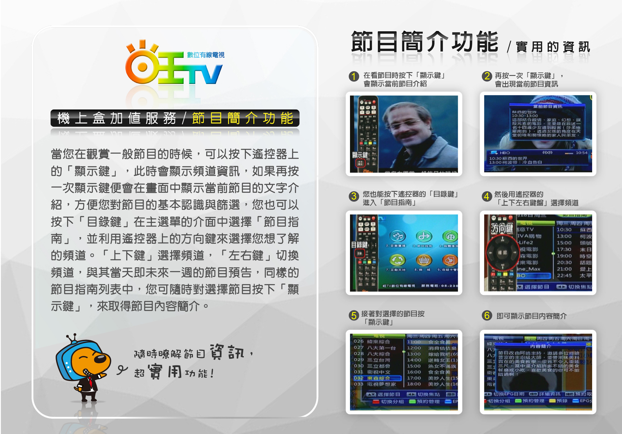請善用「節目簡介與週節目表」功能以獲得最佳的收視效果!